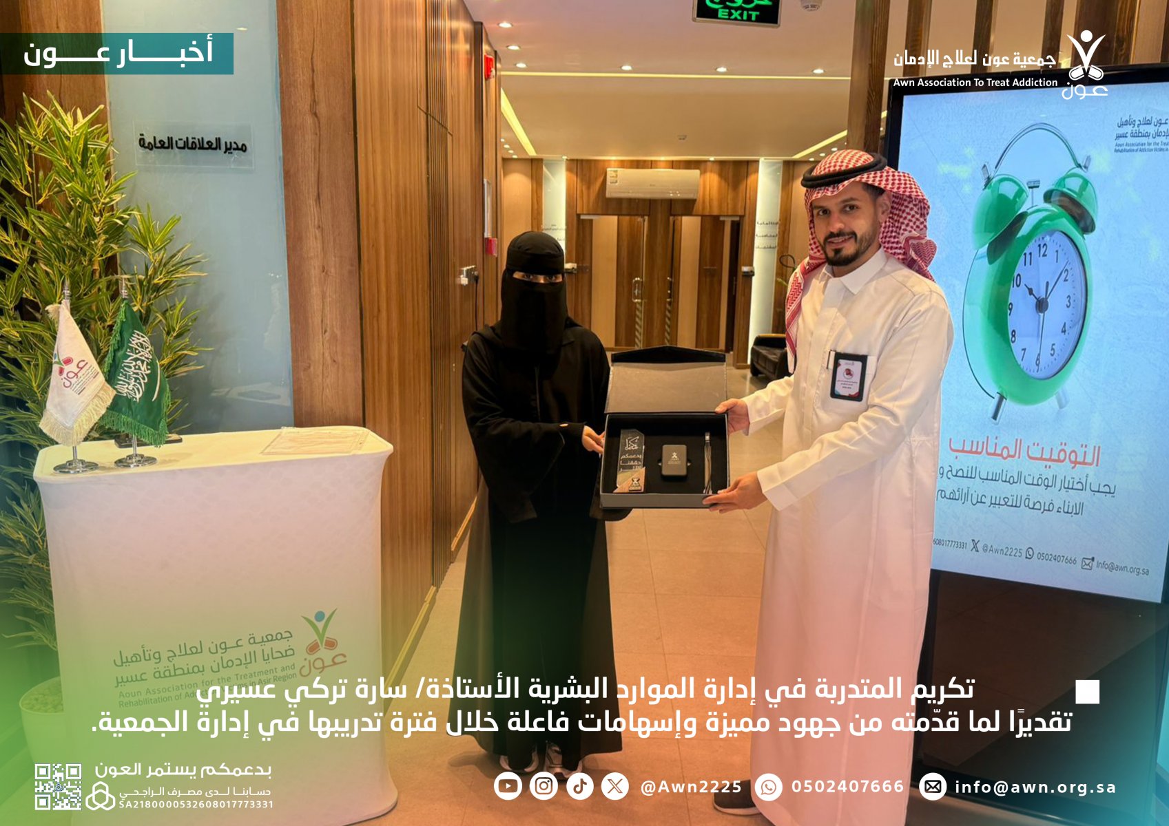 تكريم المتدربة في إدارة الموارد البشرية الأستاذة/ سارة تركي عسيري، تقديرًا لما قدّمته من جهود مميزة وإسهامات فاعلة خلال فترة تدريبها في إدارة الجمعية.